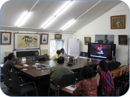 圖2 我公司領導與白(bái)秘書(shū)長(cháng)正在觀看(§&™kàn)天津大(dà)劇(jù)院歌(gē)劇(jù)廳的§¥(de)宣傳資料片