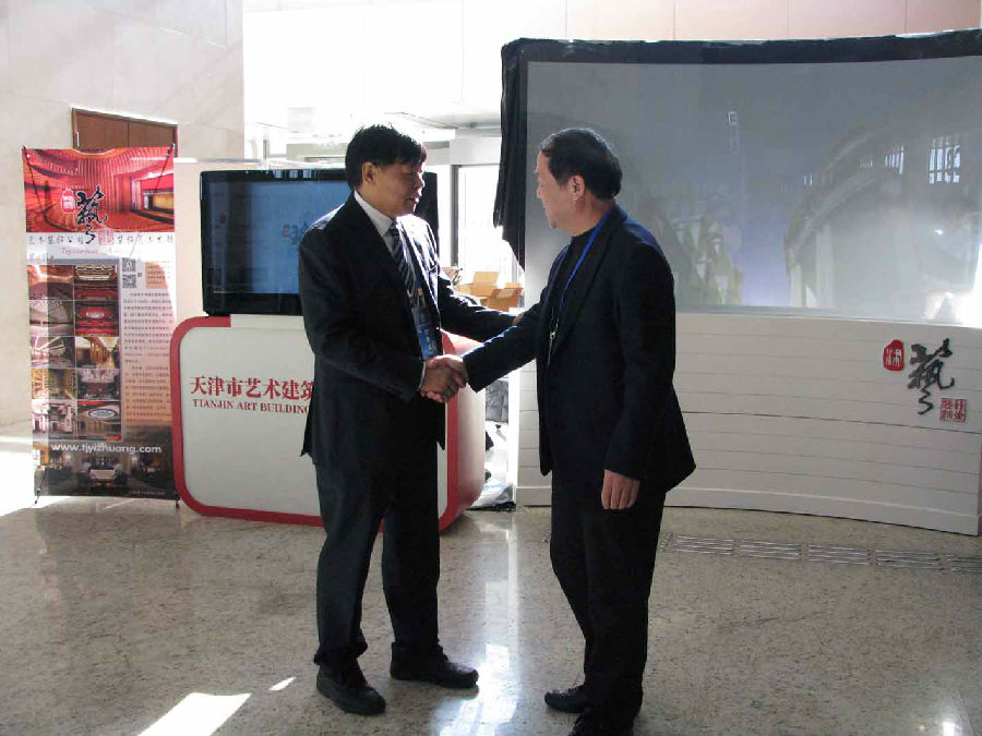 中國(guó)建築裝飾協會(huì)副秘書(shū)∞☆ε長(cháng)陳新與我司總經理(lǐ)劉捷握手并進行(xíng) Ωα工(gōng)作(zuò)交流